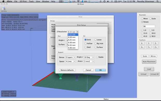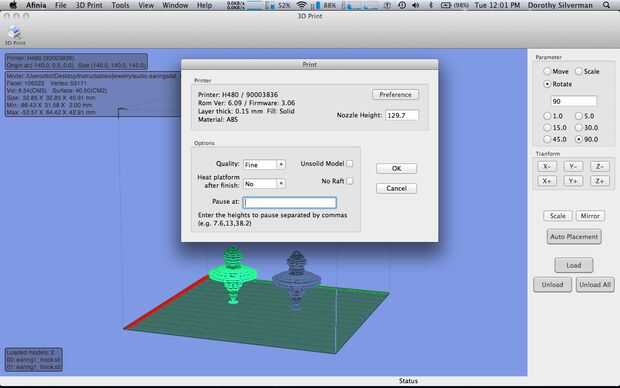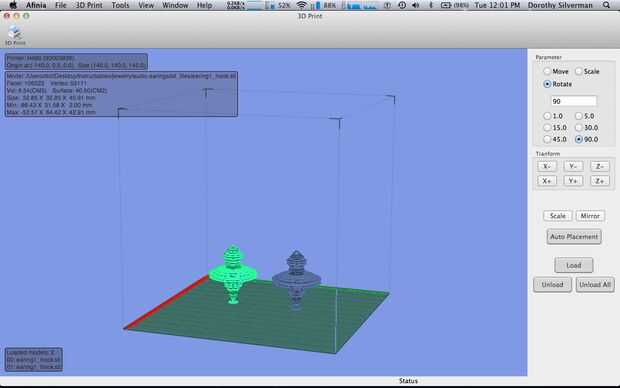 Suponiendo que tienes dos orejas perforadas, usted querrá imprimir dos el misma pendiente. En el entorno de Afinia, hacer una copia de su modelo de pendiente seleccionando 'Herramientas' -> 'Copiar' -> '1'. Rotarlos tanto 90 grados en el tablero para que los ganchos se colocan hacia abajo en el tablero. Confía en mí, otra configuraciones terminan haciendo pendientes de espaguetis!