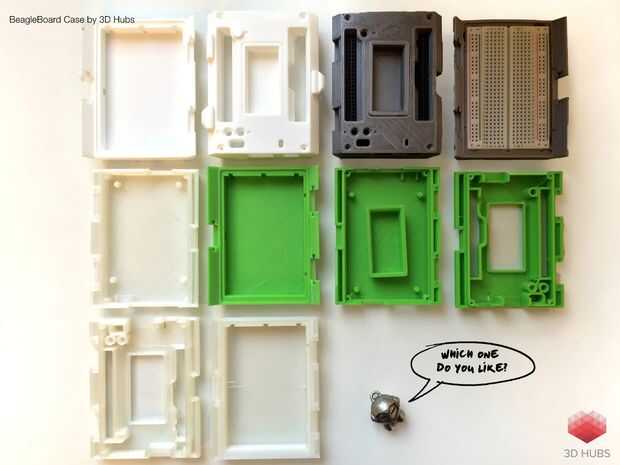 En cuanto a la Asamblea, es un proceso muy fácil pero depende de tu impresora y si las piezas son un ajuste fácil. En la siguiente imagen puedes ver los diferentes BeagleBones impresos que eran todas un poco diferentes unos de otros, a pesar de fue impresa en la misma impresora. La superior izquierda el caso es la excepción que se imprime en una impresora SLS que es mucho más precisa, robusta y también se ve mucho mejor. Este caso fue impresa con nuestro nuevo servicio HD de cubos 3D ahora proporciona impresión 3D grado industrial alrededor del mundo (sí, totalmente impresionante).