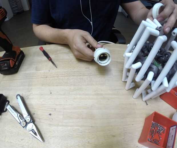 2. Repita este paso con 4 tomas en 3 secciones. Hay 24 manijas del cajón (2 por caja), que significa que hay 12 tomas. El soporte de la bombilla tiene tres postes equidistantes que se adhieren a los orificios compartidos por cada toma, así que cada sección del recinto es de 4 tomas. Es importante dejar las 3 secciones separadas porque es la única manera que tendrás espacio para atornillar las manijas del cajón en su lugar.