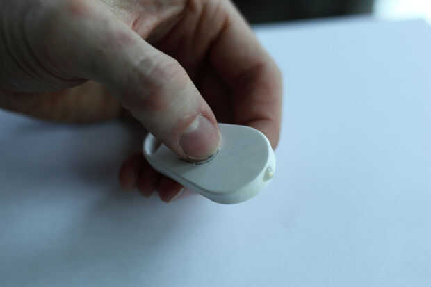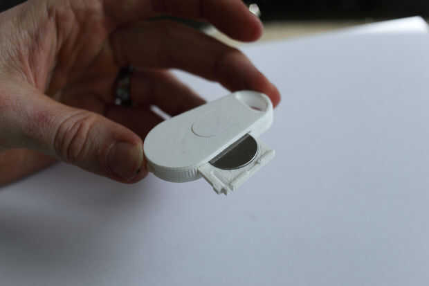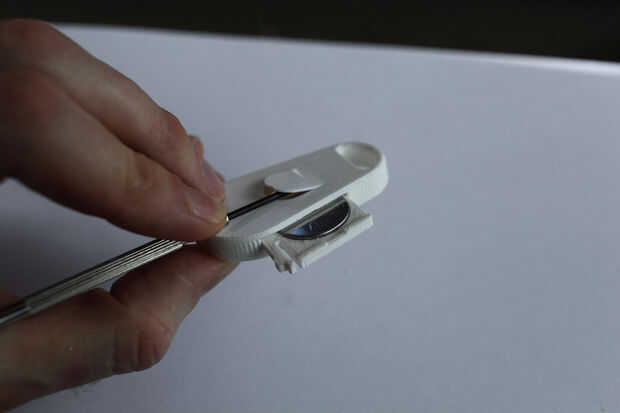 El último paso es insertar la batería y el soporte de la batería en la carcasa. Asegúrese de que la pila con el lado positivo (+) hacia arriba. A continuación, tome un pequeño destornillador (o similar) e insertarlo en la ficha botón y levante la lengüeta de plástico del botón y el LED superior de la pierna hacia arriba ligeramente. Mientras que sostiene, deslice con cuidado la batería y el titular de la vivienda. La batería debe deslizarse entre cada una de las patas del LED. Importante: No fuerce el soporte de la batería en su lugar si están interfiriendo las patas del LED, de lo contrario se curva y dañar las patas del LED. Como se mencionó, entonces son difíciles de doblar nuevamente en su lugar! Así que sea paciente y tómese su tiempo!