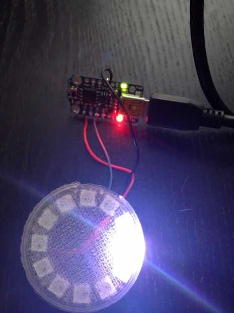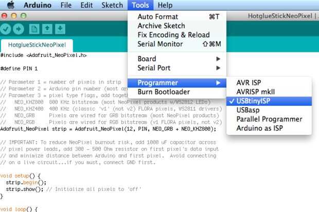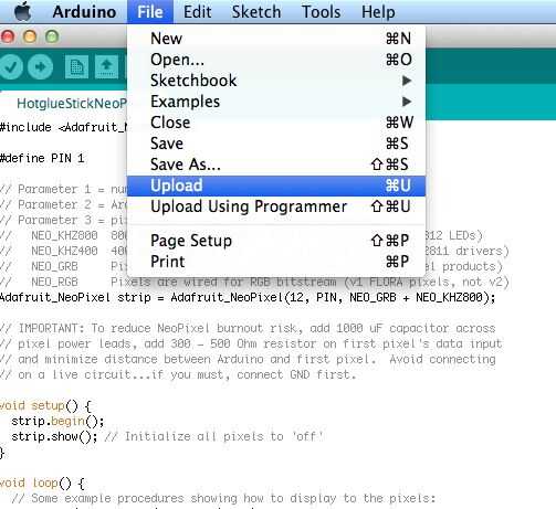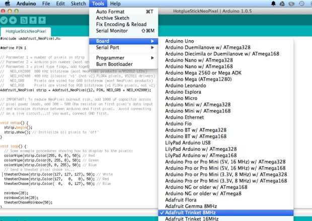 Una vez que su IDE es ir a archivo > ejemplos > HotglueStickNeoPixel.ino. También seleccionar la Junta utiliza (Herramientas > Junta Directiva > Adafruit baratija 8MHz).