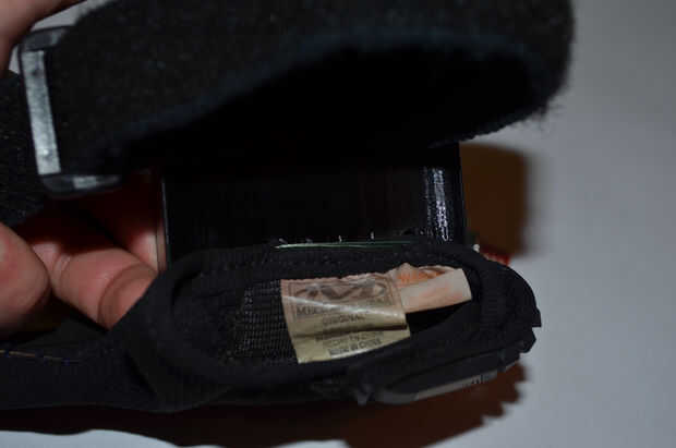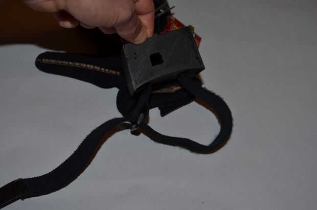 • Introducir el extremo libre de la correa a través de una de las ranuras en la parte inferior de la caja y vuelve a salir la otra ranura. Tire a través hasta que el clip es aproximadamente una media pulgada de la caja e introducir el extremo libre a través del clip.