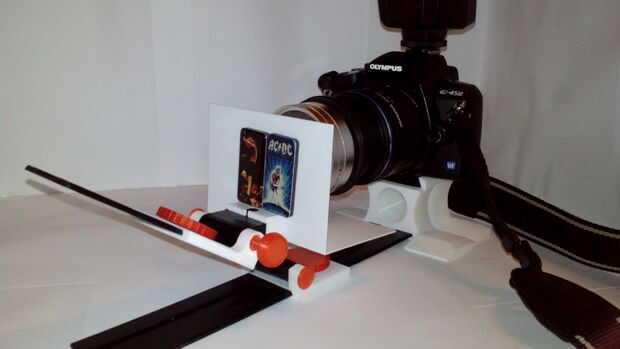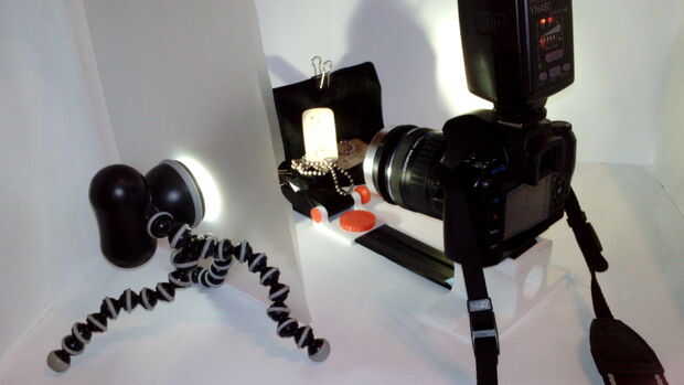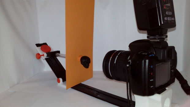 La cámara se fija en el estudio y el escenario con su motivo es ajustable. Con el estudio se puede ajustar la profundidad de campo que hace más fácil si usted tiene una cámara digital o le dará más oportunidades con una cámara reflex. También no tienes que usar un trípode. El escenario es muy flexible, se puede mover hacia arriba y hacia abajo, hacia adelante y hacia atrás y se puede colocar en cualquier ángulo. Puede cambiar las etapas para obtener otro fondo o accesorio para su motivo. Con estas cosas pueden ser totalmente creativo. Por ejemplo, usé algunos masilla para fijar el motivo a una pluma clara así que parecía estaba levitando. O era capaz de usar imanes para sostener una aguja sin los imanes en el cuadro