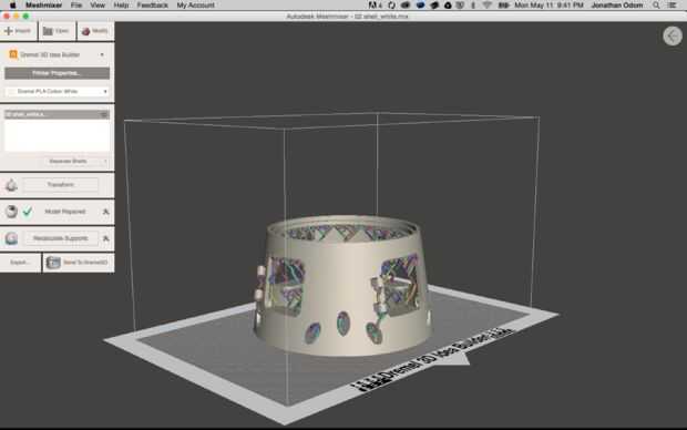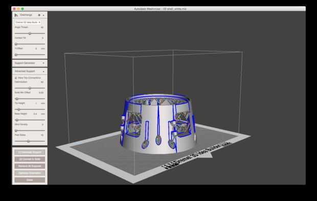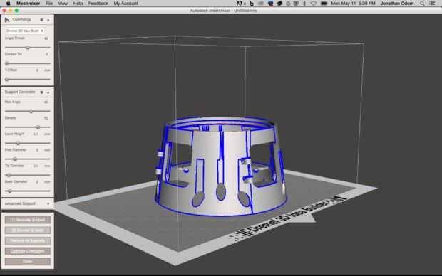 He utilizado Meshmixer para preparar mis archivos para impresión porque te da mucho control sobre el modelo mientras que proporciona por defecto útiles que usted puede modificar ligeramente para obtener los resultados que desea. MeshMixer tiene ajustes de carga para el constructor de Idea Dremel (volumen de acumulación, etc.) que le ayude a posicionar su modelo y crea estructuras de apoyo. Estos son los pasos para preparar un modelo para la impresión.