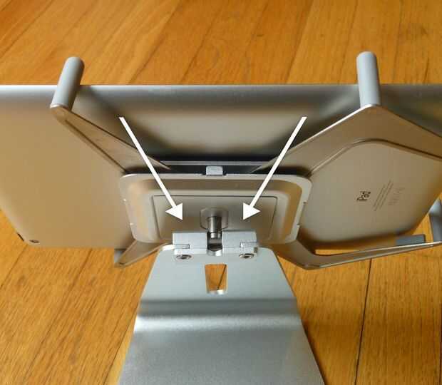 Lo primero que pensé fue poner topes de goma entre la placa trasera de la parte delantera y el eje horizontal del soporte como se indica por las flechas de arriba. He probado a todo tipo de topes de hule, topes, las probabilidades y termina en la ferretería. Todos ellos parecen funcionar hasta cierto punto hasta que rotaba la tableta. Todos ellos eran demasiado gruesas para convenientemente girar el iPad, o se desprenda en el proceso.