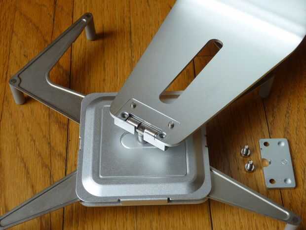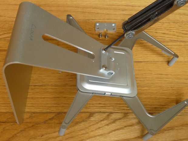 4. Para acceder a los tornillos en la parte delantera de la placa, tapa la parte inferior del soporte en sí mismo, manteniendo la cara del soporte hacia abajo sobre la superficie de trabajo. Ahora estarán los tornillos frontales.
