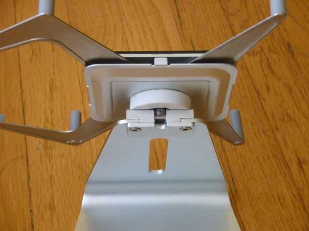 En la imagen de arriba puede ver la tablet stand montado con la espuma en lugar del buje. La espuma buje ayudó, pero esto falló en última instancia también. Era demasiado suave y no proporciona suficiente fricción. Eventualmente se convirtió en permanentemente comprimido en posición horizontal, y otra vez la tableta empezó a rotar molesto. Pero he aprendido algunas cosas en el camino.