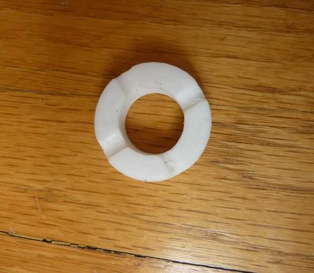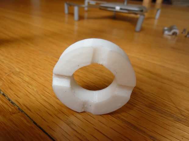 Que jugó con Ninjaflex, tuve una idea de sus propiedades. Sabía que era definitivamente más rígido que el buje de mi espuma, así que lo siguiente que hice fue agrandar el agujero central. Como el casquillo de la espuma tendría que estirar sobre el eje. También redujo el espesor del diseño porque sabía que él no comprimir tanto como el casquillo de la espuma. Decidir cuánto ajuste a estos cambios de dimensión era esencialmente una suposición inteligente basada en mi conocimiento de las diferencias entre los dos materiales.