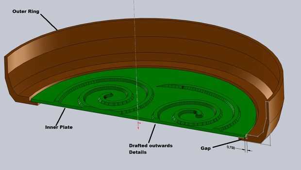 Para este proyecto, elegí los 4 elementos de la popular serie Avatar the Last Airbender. El molde se hará en dos partes para permitir la fácil desmoldeo. Habrá un anillo externo y una placa interna que encaja entre sí. Ver las siguientes imágenes. Hora de diseñar esto, asegúrese de que la brecha entre las dos partes es suficiente para que la placa interior se ajusta hacia abajo en el anillo exterior (hice esta .75mm de espacio en cada lado, o la diferencia de 1,5 mm entre los dos diámetros). Cuanto menor sea la brecha, la mejor.