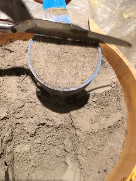 La pequeña etiqueta en el lado del cubo, dice que su proporción de agua al concreto debe ser de 5.5:1. Mezclé según que la relación y se convirtió en una mezcla de la consistencia del helado y era bastante difícil de verter en el molde. No mezclar lo suficiente por lo que terminó un segundo lote de la mezcla con más agua (era la consistencia de helado semi derretido) y que vertido mucho más fácil.