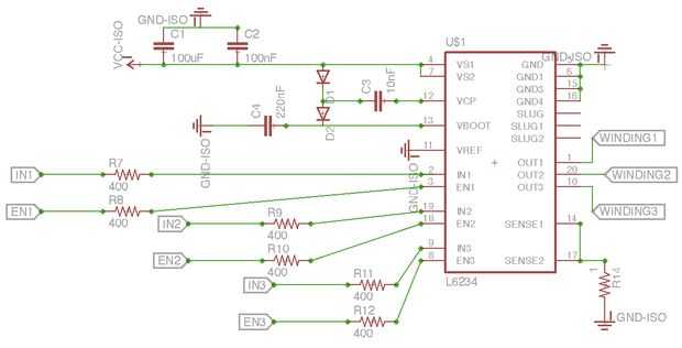 Los componentes del circuito deben cablearse juntos según el esquema siguiente. VCC para el conductor del motor de L6234 puede ser en cualquier lugar de cerca de 7 V hasta 42 V, pero no recomiendo funcionando este motor superior a V 12ish.