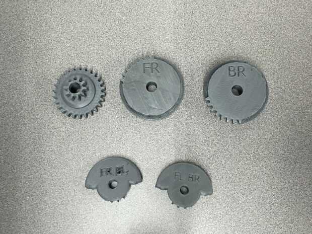 Las siguientes piezas necesitarán ayudas para imprimir correctamente: GearSet_BL, GearSet_FL, GearSet_BR, GearSet FR, LiftGear_FRBL y LiftGear_FLBR.