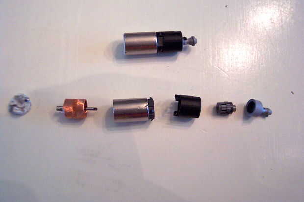 Desmonté una a ver si podía conseguir que vuelva a funcionar y descubrió lo guay son los interiores. Si se separan las piezas superior e inferior del motor no es es gran cosa porque el fondo es la bobina de alambre y eje mientras que la parte superior es la caja de engranajes. Puede ser colocados hacia atrás junto con ningún problema. Por desgracia he encontrado el motor de fijación por soldadura cables nuevos en él imposible. Mi una solución semi es perforar dos agujeros donde los cables se salieron del motor y si te dejas dos cables y jimmy que alrededor un poco pueden conseguir el motor para trabajar, aunque con una conexión intermitente. Cosas apenas tener en cuenta!