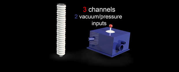 En el joystick centro gestionamos el aire que viene de la manguera de la aspiradora y de la salida de presión del aspirador. Dependiendo de la posición de lo joystic distribuye + / - presión al mismo tiempo para cada compartimiento. Tiene presión de dos entradas y salidas de tres cámaras. Puede imprimir un joystick adicional si desea controlar la otra extremidad de triple cámara.