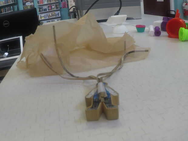 Hice mi simple paracaidista de una bolsa de plástico, cinta, cortarla y una figura de madera que es parte de nuestra biblioteca tren de sistema de la tabla. Usted puede utilizar fácilmente una figurita LEGO, muñeca de Troll (¿los niños todavía juegan con estos?), pequeña figura de acción, prácticamente nada. Material del paracaídas está totalmente hasta usted! Tratar de tela, papel de tejido, bolsos ziplock, GO CRAZY! Después de configurar esto y probando hacia fuera después de un tiempo de historias, todos los niños quería dejar caer las cosas al azar que había en la biblioteca, así que empezamos a caer los dados, otros estampados 3D, las llaves de mi, tacos papel, cualquier cosa que pudo encontrar y era lo suficientemente seguro para caer.