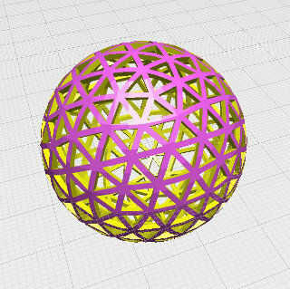 function main(){ // definitions var ballDiameter = 40; var ballRadius = ballDiameter/2.; var wallThickness = 1.0; var segmentWidth = 1.1; // width of an individual link of the structure var sphereRes = 33; var subdivisionDepth = 2; var outerSphere = CSG.sphere({ center: [0, 0, 0], radius: ballRadius, // must be scalar resolution: sphereRes // optional }); var innerSphere = CSG.sphere({ center: [0, 0, 0], radius: ballRadius - wallThickness , // must be scalar resolution: sphereRes // optional }); var ball = outerSphere; var geoSphereTris = []; // list of geosphere triangles addPolyCb = function(v1, v2, v3) { geoSphereTris.push([ [v1.x, v1.y, v1.z], [v2.x, v2.y, v2.z], [v3.x, v3.y, v3.z] ]); } createGeodesicSphere(addPolyCb, subdivisionDepth); // successively substract each prism from the ball for(j=0; j!=geoSphereTris.length; ++j) { var prism = createPrism(geoSphereTris[j], ballRadius, segmentWidth/2.); ball = difference(ball, prism); } ball = difference(ball, innerSphere); // hollow out the inside return ball; } Una vez generado el modelo, se puede exportar directamente en STL formato usando el