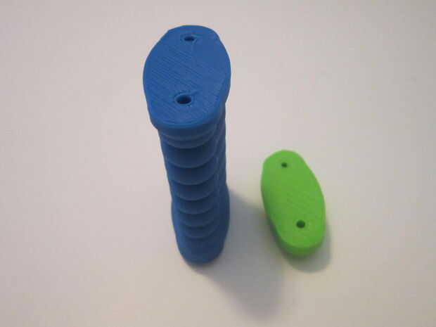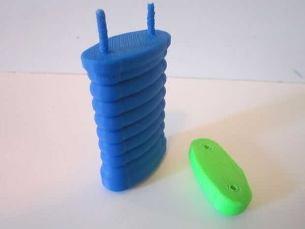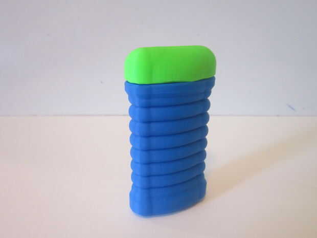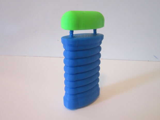 Después de tener impresas todas las piezas, empezar a puntearlos juntos. En primer lugar, inserte dos de los pernos en los orificios de la base de la manija. Montar la tapa sobre estos alfileres y presione firmemente los dos pedazos juntos.