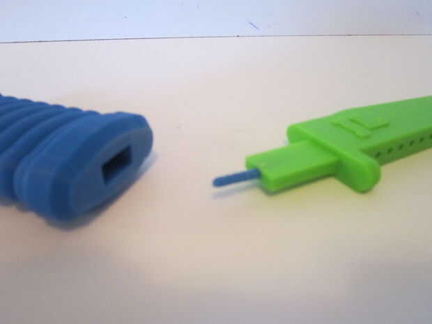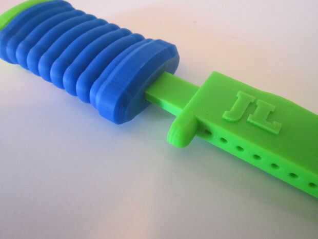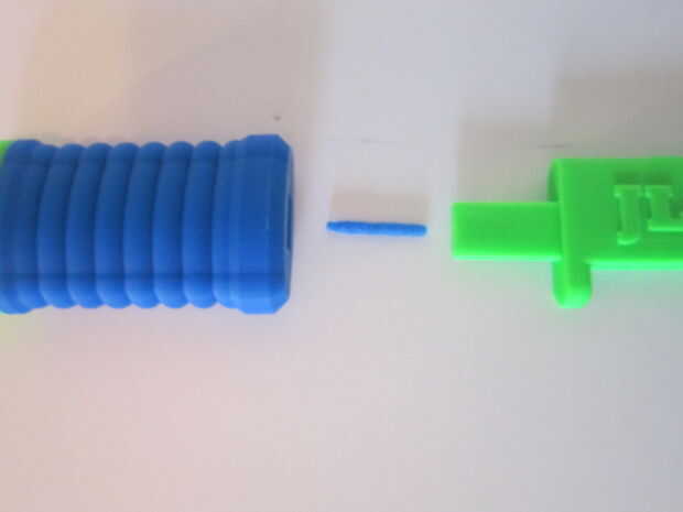 Ate el pedazo de mainbody al mango de la misma manera que se une la tapa del extremo. Sólo que esta vez Inserte el pasador en la pieza de mainbody primero, luego inserte ese pedazo de la manija. El perno debe engranarse con el agujero en la parte inferior del eje rectangular en el mango.
