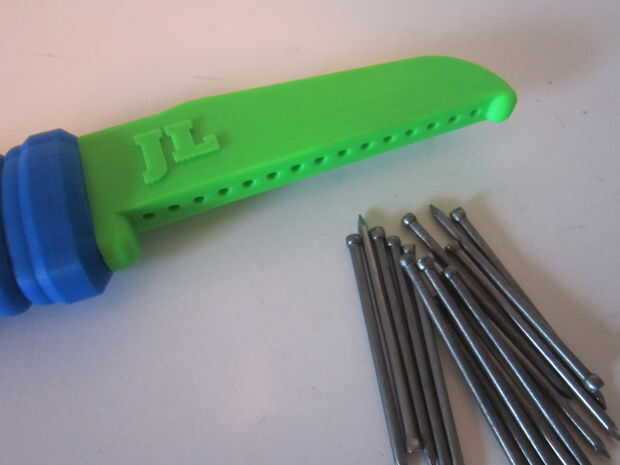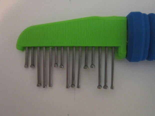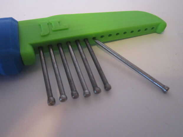 Se necesita 15 clavos como dientes de peine. Simplemente inserte en sus agujeros y presiónelas firmemente en su lugar. Si lo desea, puede utilizar un par de alicates para cortar las uñas un poco para crear dientes de más o menos como se ve en la foto de arriba.