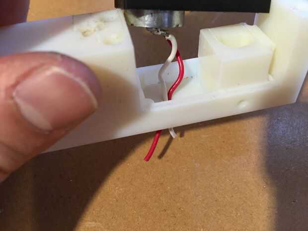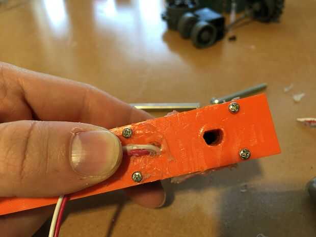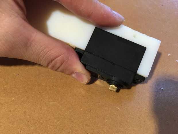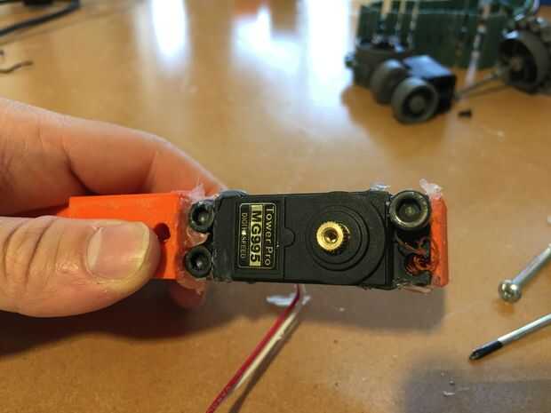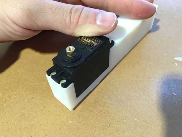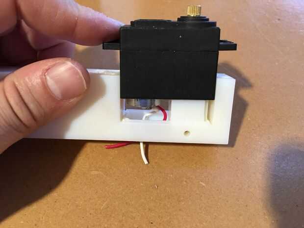 Como se ve en las fotos, poner el motor del servo en nuestra 3D parte impresa. (Puede que necesite presentar la parte impresa 3D un poco para montar el servo dentro) No te olvides de sacar los cables desde el pequeño orificio en la parte impresa 3D