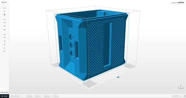 Empezó desde la creación de un modelo en un programa de CAD, entonces él importados al software de corte Z-Suite donde él establece todos los parámetros como tipo de relleno, grosor de capa y ángulo de apoyo. El programa muestra el tiempo aproximado de la impresión y el uso del filamento.