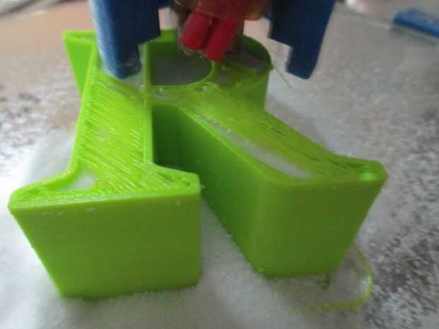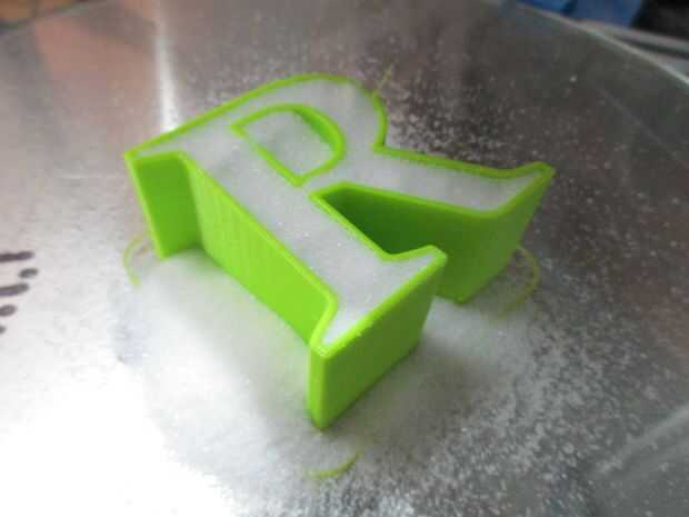 Utilice un embudo para verter el azúcar en tu impresión, llenándolo hasta justo debajo de la capa actual. Está bien si usted derrama en la cama de impresión-usted puede limpiarlo después. Seguir la letra y ver como el interior azucarado está cubierto en capas de plástico. Quizás tenga que apagar manualmente el ventilador extrusora si su impresora tiene uno; de lo contrario azúcar obtiene soplado fuera de la impresión y en todas partes.