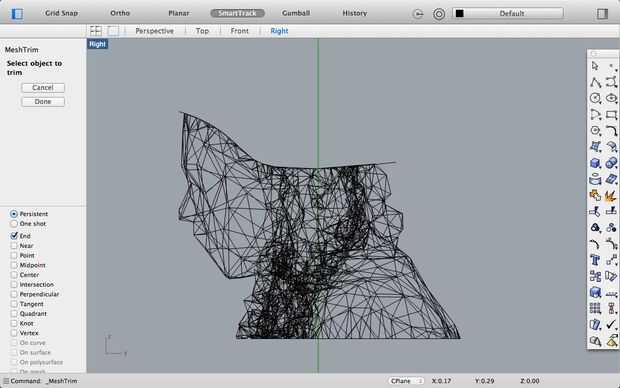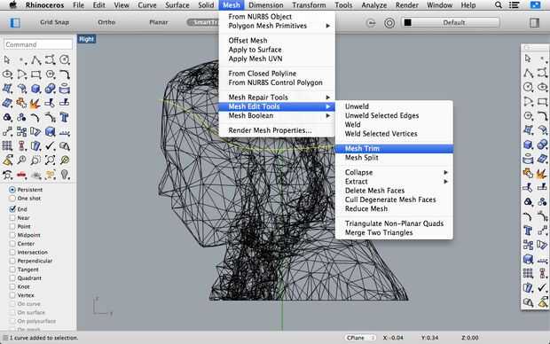 Una vez que ha dibujado una línea que está satisfecho con, utilice el comando 'MeshTrim' y seleccione la línea como el objeto de cortar y seleccionar el área en su modelo 3d por encima de esa línea como el objeto a recortar.