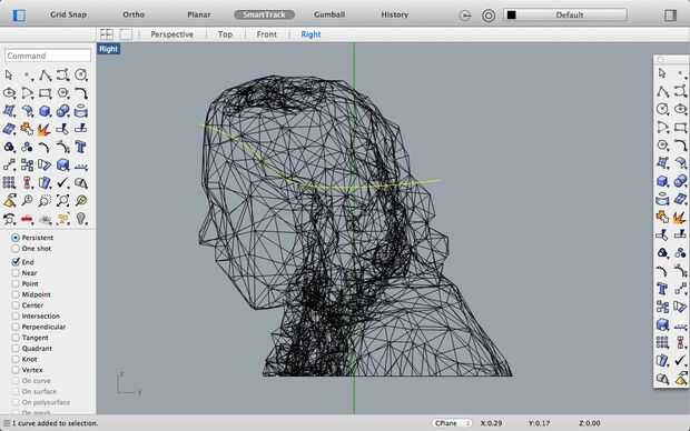 Para quitar la parte superior de la cabeza, mirar el modelo en la vista izquierda o derecha. El comando 'curva', dibuja una línea donde quieres que la abertura en la parte superior de la cabeza. Para mis macetas, empecé por trazar la línea del cabello de la parte superior de la frente hasta que llegué a medio camino a través de la cabeza. Luego terminé la curva siguiendo la línea recta en la parte posterior de la cabeza.