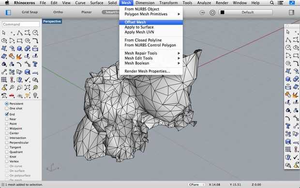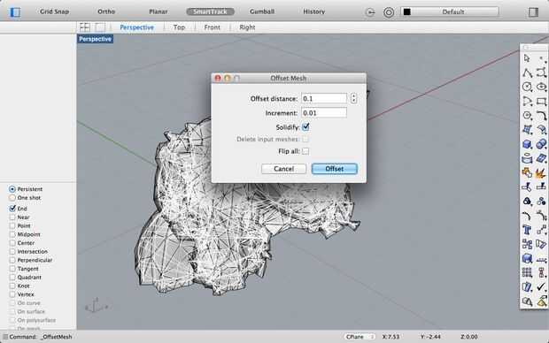 ' En su estado actual, la malla que tenemos ahora es sólo una superficie y tenemos que convertirlo en un sólido. Para ello, utilice el comando 'OffsetMesh'. Cuando se ejecuta este comando, aparecerá una pequeña ventana le pide alguna información. Lo que realmente tenemos que prestar atención a es la Distancia de Offset. Este valor sin embargo gruesa le su jardinera a ser, pero mi sugerencia es ir más fino más grueso. Para los míos, utiliza una distancia de Offset de 0.1 y funcionaba fantásticamente. Además de elegir una distancia de Offset, asegúrese de que tiene una marca de verificación en el cuadro de solidificación . Una vez que ha hecho estas dos cosas, oprima el botón de desplazamiento .