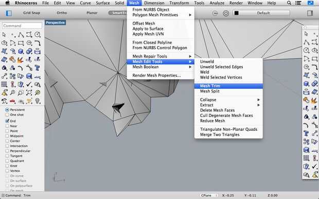 Más a menudo que no, encontrará algunas áreas desordenados después de compensación de la superficie donde son meter caras de malla de lugares que no quieres. Para eliminar estas caras, seleccione su modelo y ejecutar el comando 'explotar'. Esto separará el modelo en algunas superficies diferentes. Ahora, utilice el comando 'MeshTrim' con la superficie que son intersección de las caras de acoplamiento no deseado como su objeto de corte y una cara de acoplamiento no deseado como el objeto a recortar. Más probable es que deberás repetir este comando varias veces debido a que las caras de acoplamiento no deseado probablemente se ubicará en varias superficies. Una vez que haya quitado estos caras de malla, seleccione todas las superficies y utilice el comando 'Únete' para combinarlos nuevamente.