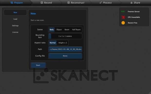 Ahora, abra Skanect. Si todo está conectado correctamente, debe haber un icono verde en la esquina superior derecha de la ventana de Skanect que dice "Freenect Sensor". Si usted engancha algo por el camino equivocado, en lugar del icono verde, verá un icono amarillo y un mensaje que dice 'Estructura Sensor esperando Uplink...'.