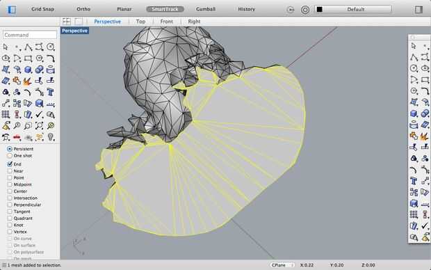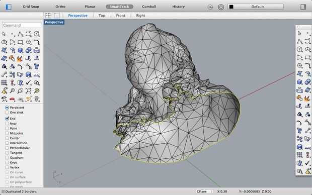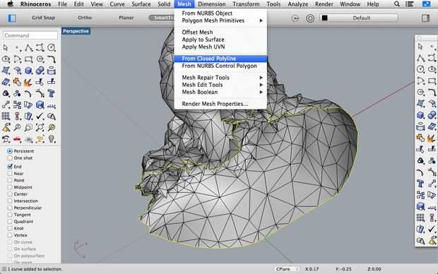 Ahora que hemos ajustado nuestro modelo, necesitamos hacer sólida una vez más. Para ello, seleccione el modelo 3d y utilice el comando 'DupBorder'. Esto creará una línea alrededor de la base hueca de su modelo. Necesitamos crear un plano de esta línea que podemos hacer seleccionando la línea y luego ejecutar el comando 'MeshPolyline'.