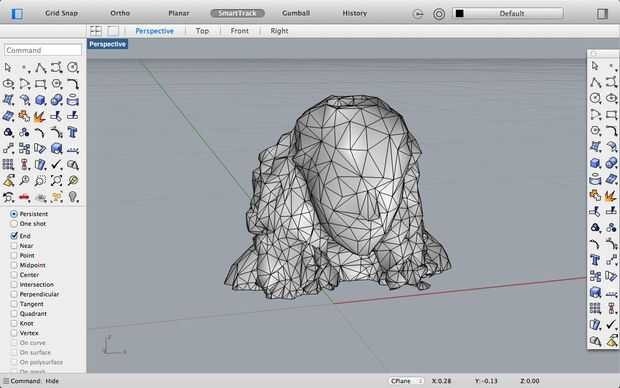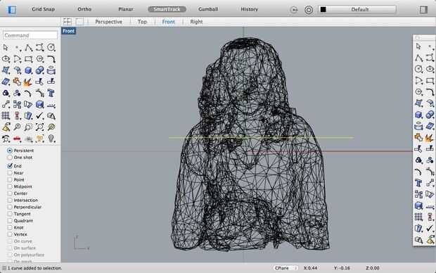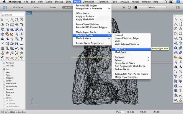 Creación de una base plana para nuestro modelo 3d es realmente muy simple. Para empezar, mira el modelo en la vista frontal y utilizando el comandoline, dibuje una línea donde quieres cortar el modelo para crear una base. Una vez que esta línea se ha hecho uso el comando 'MeshTrim'. Cuando se le pida para seleccionar un objeto de corte, seleccione la línea y cuando se le pida para seleccionar un objeto para recortar, seleccione la parte de su modelo 3d debajo de la línea que desea quitar.