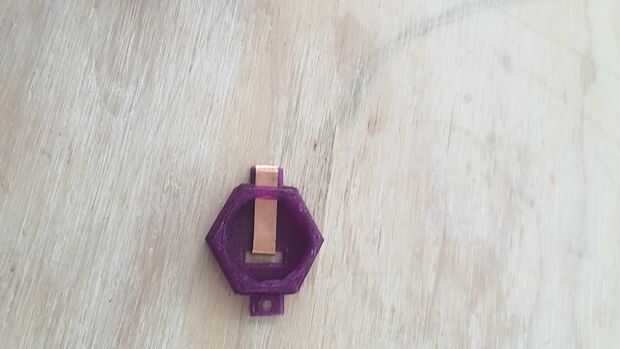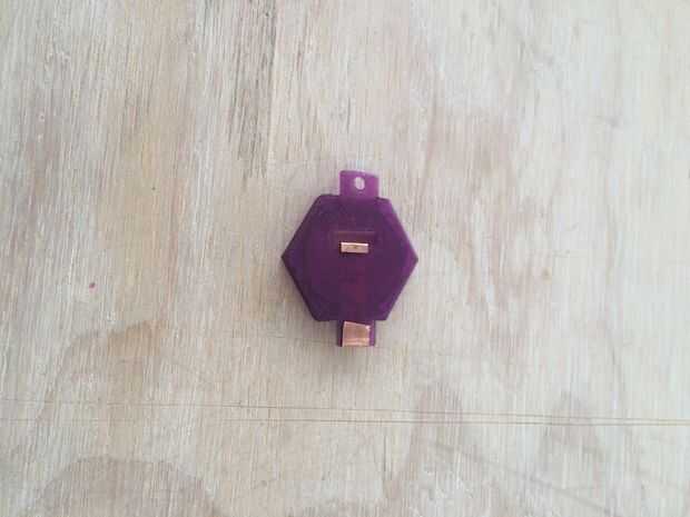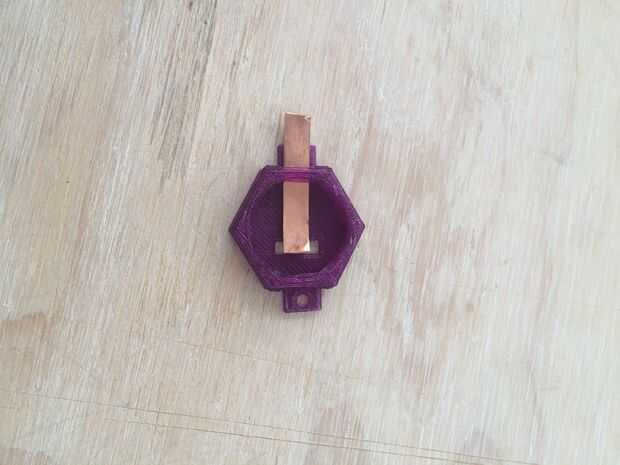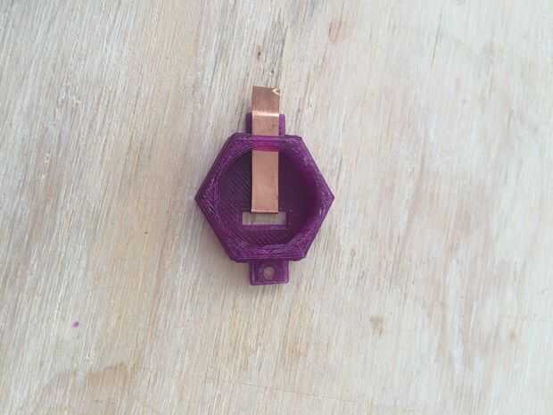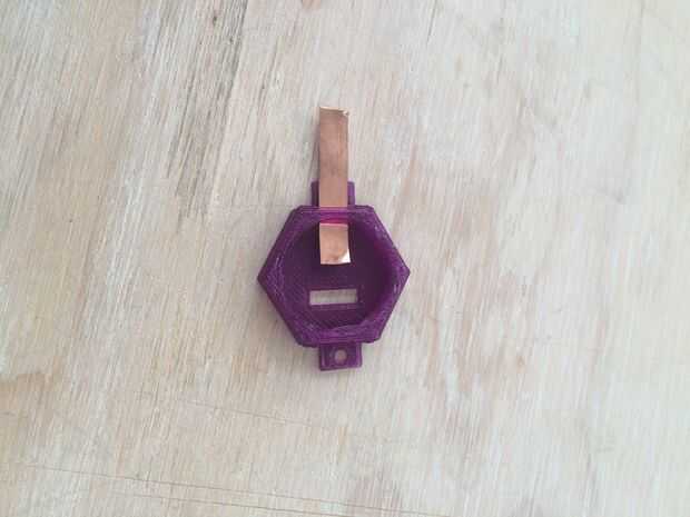 1. Empuje la pieza de 3cm de cobre a través de la ranura como se indica en la foto, nota el agujero en la base está más cerca de lo que será el terminal más corto positivo.