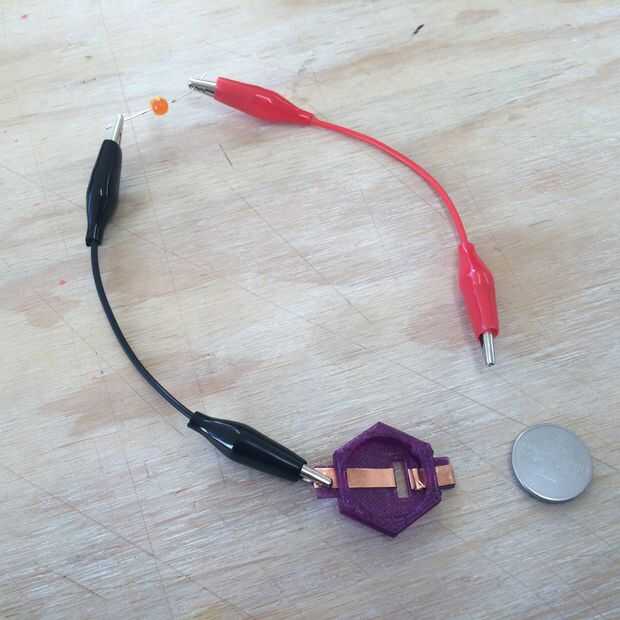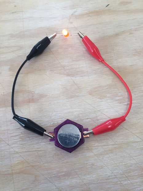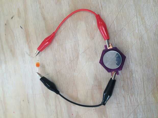 2. Conecte 2 pinzas a los terminales positivo y negativo y fije a las correspondientes patas de un LED. Deberá encenderse.
