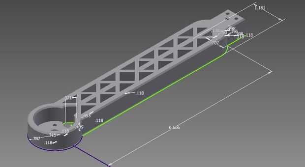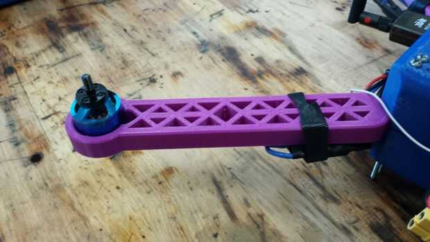 Nuestro marco y los brazos están diseñados para caber juntos con tres 4" largo 1/8" espesor tornillos por brazo. Nuestros brazos son 21 centímetros de largo y están diseñados con cerchas para crear la estructura más fuerte mientras que también mantiene el peso bajo. Los soportes del motor están diseñados para nuestros motores de la casa si las cubiertas volando. Los motores se fijan con tornillos debajo de ellos. Estos montajes fueron diseñados usando Autodesk Inventor e impresión con la misma configuración como nuestras anteriores impresiones. El brazo en el paso 8 es un archivo .stl de nuestro brazo.