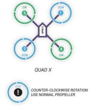 Todas las hélices girando hacia la derecha deben ser propulsores de empuje (motores de 3 y 4 en el diagrama), y todos los apoyos a contador de rotación hacia la derecha deben ser hélices normales (motores 1 y 2 en el diagrama). Asegúrese de que tiene motores adecuados para tu helicóptero y hélices adecuadas para su helicóptero. Nuestros propulsores son 10.5" apoyos que efectivamente han sacado a nuestra máquina.