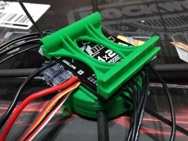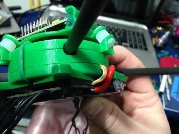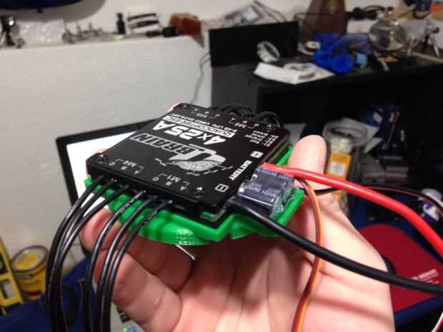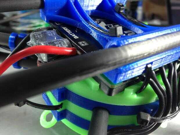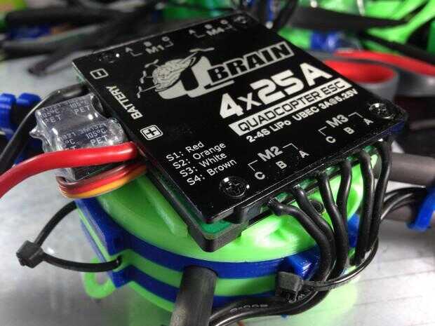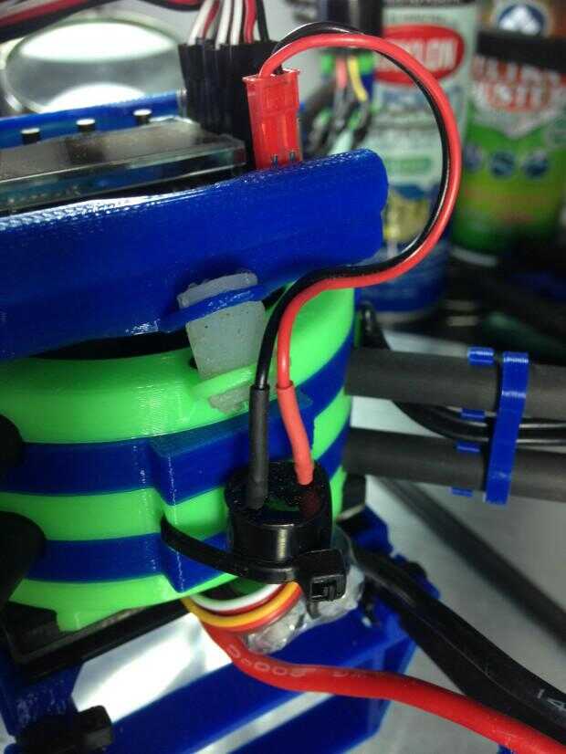 Montar el ESC - ESC Q el cerebro se ajusta en la parte inferior del marco. Observe que los condensadores deben mirar hacia adelante, y hay un hueco para pasar los cables de 4 control debajo del ESC y a través del marco del helicóptero.