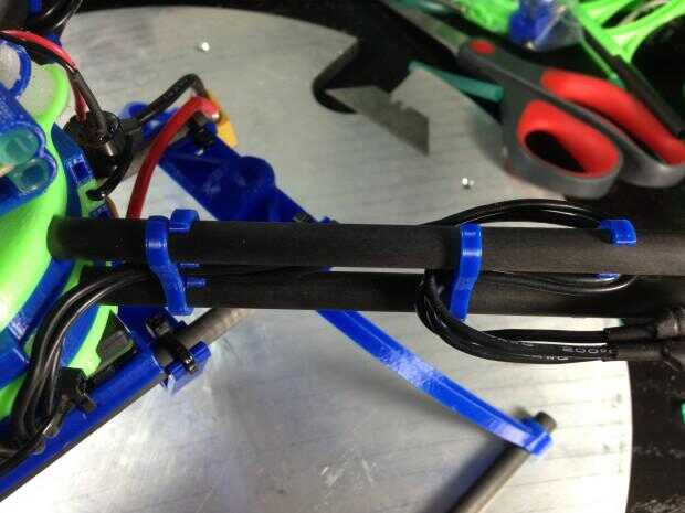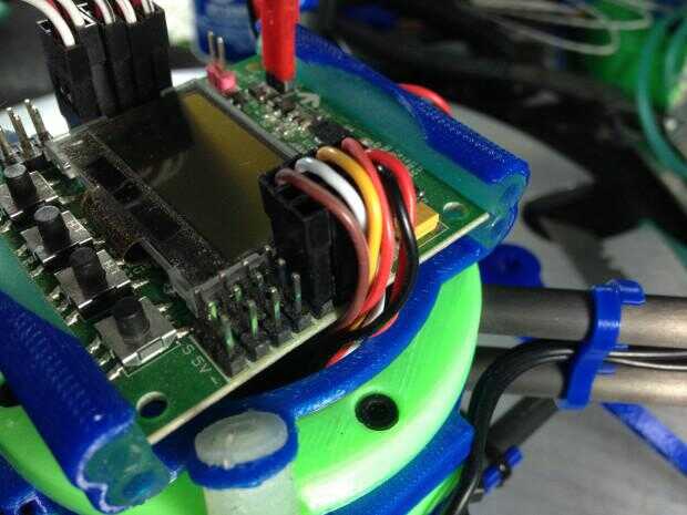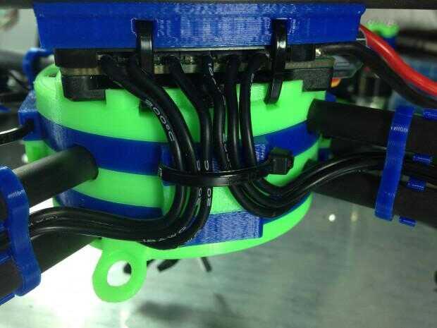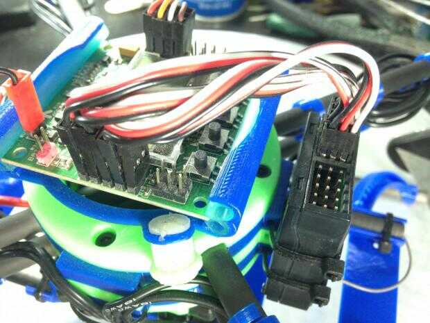 Cableado de los motores - el último paso es conectar tus motores a sus CES. Cables de salida del cerebro de los Q se presentan en un orden aparentemente extraña, y que incluso he leído quejas sobre esto en los registros de construcción de otras personas. Resulta que, si se monta con la placa de aluminio hacia abajo y los condensadores frente a remite (que hace de este diseño), las salidas motor alineen perfectamente con la disposición de las agujas del reloj que utiliza el controlador KK. van 3 cables para cada motor, y se puede utilizar las ranuras de la brida extra así como los clips de alambre impreso para enrutar el cableado cuidadosamente y tomar el relevo de extra.