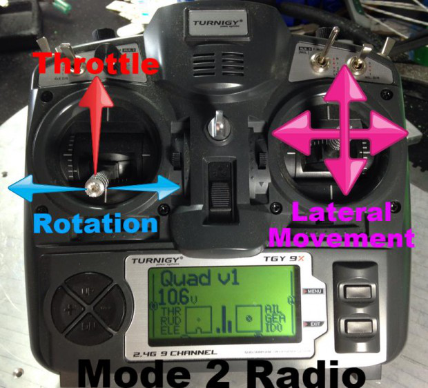 El stick izquierdo mueve hacia arriba y hacia abajo para el control de su acelerador. Mayor acelerador causa su helicóptero ascender, y menos acelerador hará que el helicóptero descienda. Mover el stick izquierdo de lado a lado hará que la nave gire o guiñada como timones en un helicóptero. El palo derecho hace el quadcopter viajar hacia adelante, atrás, izquierda y derecha, como el cíclico (joystick) en un helicóptero.