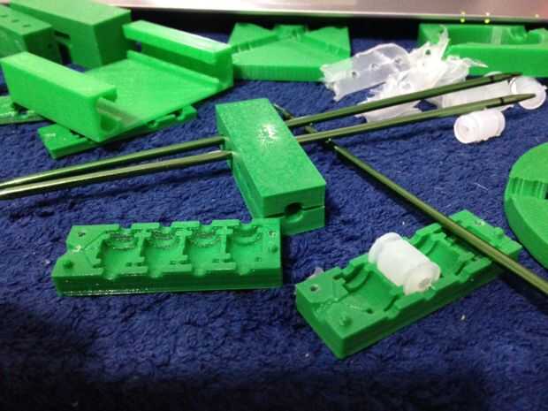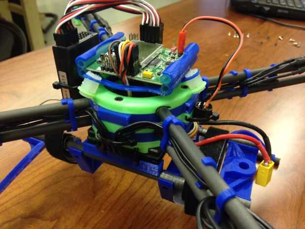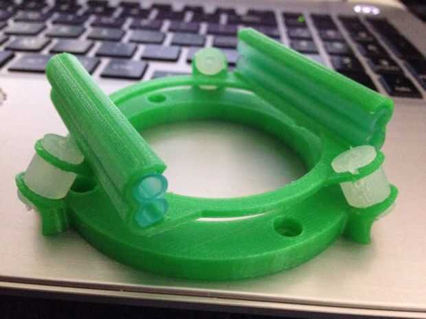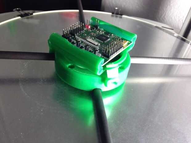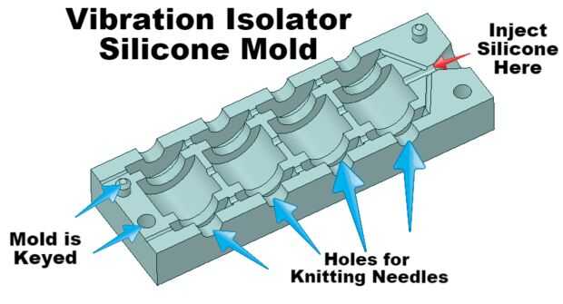 Los aisladores de 3 vibración que sujete la parte superior de la estructura para el soporte de controlador de vuelo se hacen de silicona platino en 2 partes que cura en un molde de impresión 3D. El molde está hecho de 2 piezas impresas 3D idénticos, y las mitades del molde Sujete alrededor de agujas de tejer de aluminio de modo que hay un agujero para el montaje de hardware.