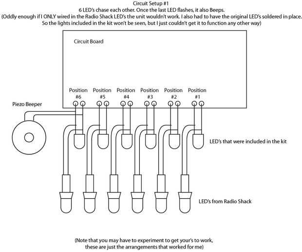 -En vez de poner 1 bombilla en cada uno de los 6 contactos, he decidido poner 2 LEDs en cada uno de los 3 contactos. He colocado 2 LEDS de 2 º contacto, contacto 4 º y 6 º contacto en el tablero. De esa manera dos luces parpadean a la vez. Como dije, experimento, tuve problemas con la mía, así que al final la tengo setup tal como se detalla arriba y conecté 1 LED original en la posición 1 (que no materia desde su interior el caso y usted no puede verlo.) Por alguna razón si suelde en un LED en la posición 1 el resto de las luces brilló sólo al azar.