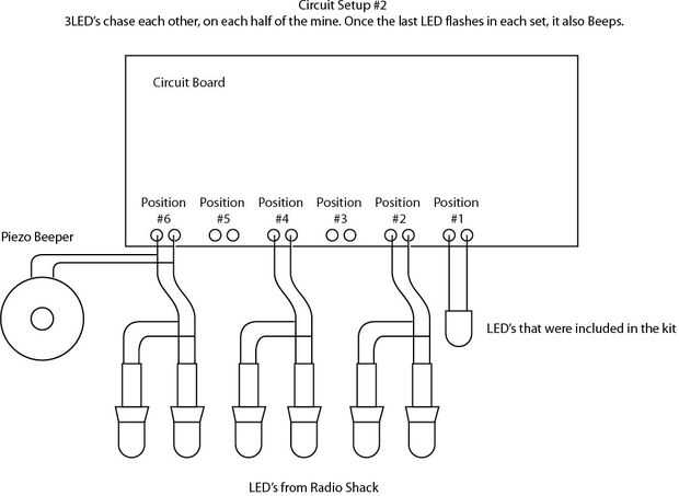 -Construir un "Mini luz Chaser LED circuito" pero en vez de instalar el LED que se incluyeron, usar las luces de 5 m m nueva spiffy. Tenga en cuenta que sólo podría conseguir esta cosa a trabajar cuando todos los LEDS fueron soldados en su lugar. Parece no le dará resultados a menos que comete y la soldadura en primera todos junto. También hay un pequeño "puente" que hará que el LED persiguen uno al otro, en lugar de running back y hacia atrás. (Las instrucciones sobre cómo hacer esto se encuentran con el cazador de luz Mini sí mismo) Ahora, hay un cambio importante que me di cuenta desde la última vez que puse una de estas... VIEJO LED de Radio Shack era fáciles de desabrochar, así sería soldarlos a la Junta, luego deslice ellos en lugar de la vivienda. PERO ahora, se producen sin la capacidad de ser roto aparte, lo que significa que ahora debe usar los cables de cada LED en su pequeño agujero en la parte superior de la carcasa antes de soldar los cables a la Junta! Si no entiendes lo que digo, simplemente instalar el LED en la mitad superior de las minas, antes de soldar a la placa de circuito. Juntos dos de los cables de los LED soldadas. De esa manera dos luces parpadean a la vez. Cada par de luces LED entonces se suelda a la 2 º, 4 º y 6 º posición en el tablero. No soy un genio con la electrónica y por alguna razón no se pudo obtener lo que el trabajo de cableado 1 LED por ubicación... me llevó bastante tiempo para conseguir algo juntos puesto efectivamente trabajadas. Por lo tanto, a cualquier persona que realmente sabe electrónica, si usted hace esto, por favor ponga algún comentario con respecto a la placa de circuito en los comentarios. Todos que estoy diciendo es que esto es un paso crítico y será necesario experimentar ya que he hecho dos de ellos hasta ahora y ambos tienen diferentes configuraciones electrónicas.
