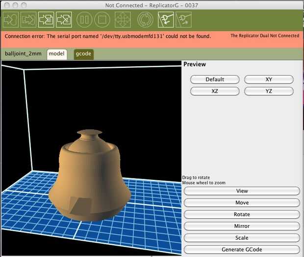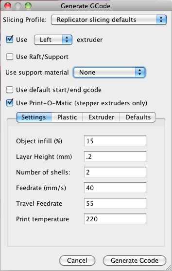 2. uso ReplicatorG/Makerware/etc. para crear el gcode para la impresión.