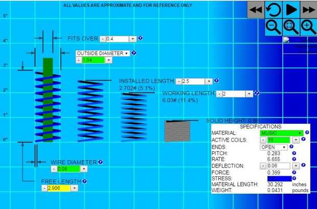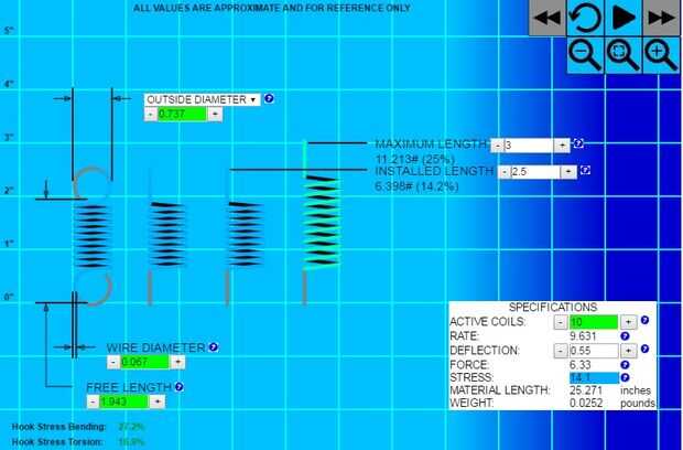 Aquí es una increíble herramienta online interactiva que puede utilizar para ver cómo diferentes cada una de las variables puede cambiar las propiedades de la primavera. Trabaja para los cuatro tipos más comunes de los resortes, es decir, diámetro constante compresión, extensión, torsión, resortes, reloj y.