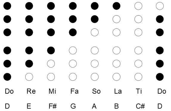 El tono o la frecuencia de la nota producida por un silbato depende de la longitud del tubo, donde cuanto menor sea el tubo, cuanto mayor sea la frecuencia o más específicamente, la frecuencia es proporcional a 1 /(tube length). Por los agujeros de corte en el tubo de silbato, que significa efectivamente el tubo, elevando el tono. Colocando cuidadosamente los agujeros y cubriéndolos con los dedos, puede crear un instrumento que puede tocar las notas de una escala. Un silbato irlandés tradicional tiene 6 agujeros para tocar una escala mayor de D; las digitaciones de estas notas se ilustran arriba.