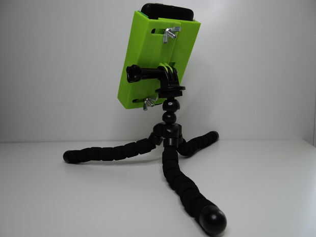 Diseñé una gopro compatible con montaje en el soporte puede montar sobre cualquier soporte de gopro, incluso en la cabeza pero no es así útil creo:). Pero útil piensa es pequeño montaje en trípode o en la ventana. Por supuesto en vez de usar 3D impreso soporte para manillares que se puede comprar uno. Y lo último es que puede sacar de su soporte de smartphone e instalar la cámara en ella sin problemas y rápido. Por lo que es bastante útil. Usted puede poner el dispositivo que la anchura es entre 5,3 y 7 cm, altura es ilimitada.