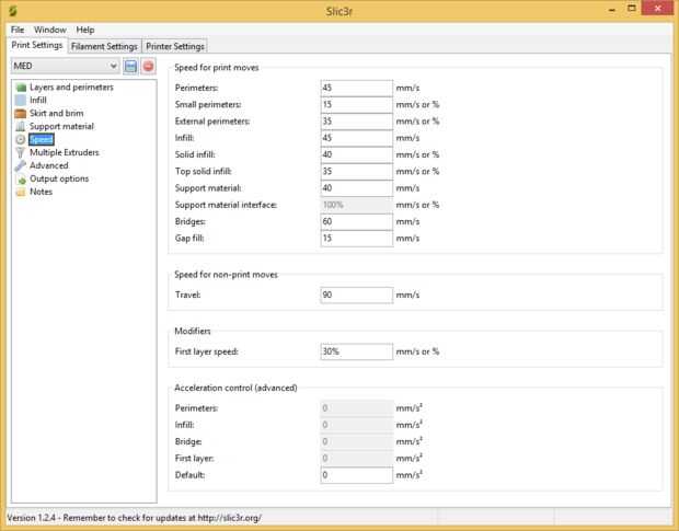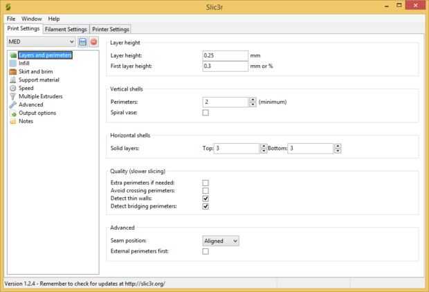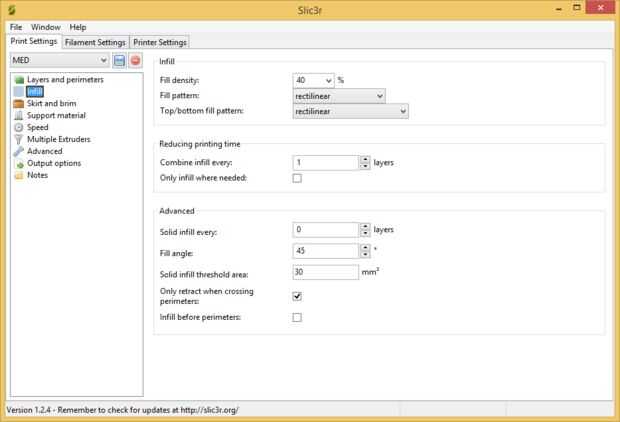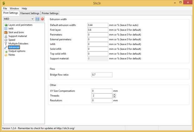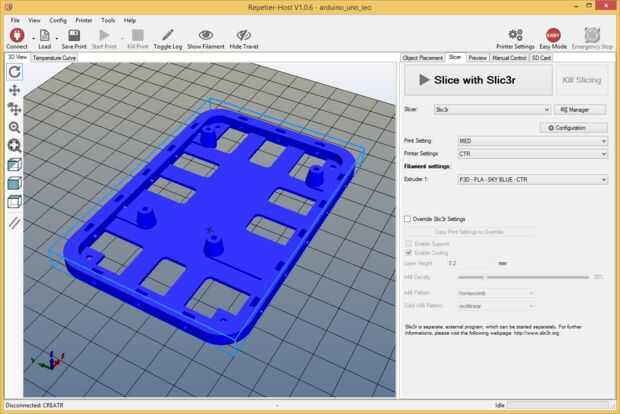 Estoy usando Repetier Host software para impresión 3D y Slic3r para cortar objetos 3D. He proporcionado mi configuración de Slic3r en las fotos de arriba, ésta es una configuración 'safe' probada en impresoras de i3 Creatr Leapfrog y Prusa. Puede que necesite ajuste diferente para tu impresora pero estos son buenos para comenzar.