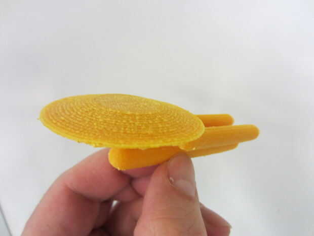 La empresa impresa es 3.5" de largo, 2" de ancho y 1" profundidad. Yo utiliza filamento ABS color oro para hacer la impresión. La empresa impresa y la vista OpenSCAD del modelo se muestran en las fotos adjuntas.