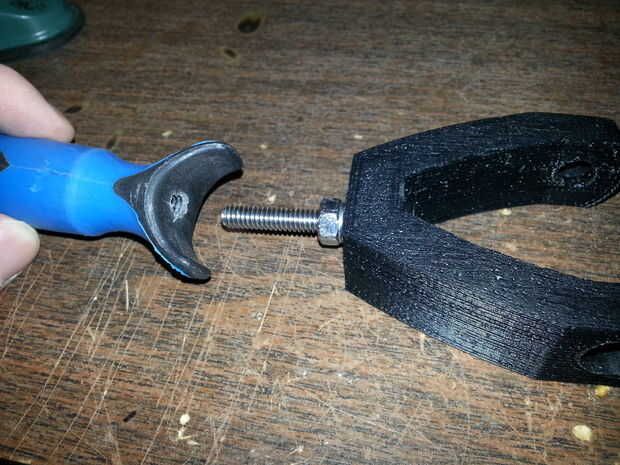 Entonces atornilla el mango de pintores directamente hacia el resto del tornillo 2". Dependiendo de su manija de pintores, puede que necesite agrandar el agujero que quedaba cuando quita el brazo metálico de él.